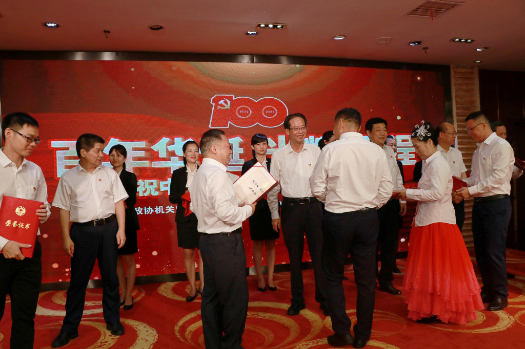 6月29日,市政协机关举行庆祝中国共产党成立100周年“七一” 表彰暨联欢会。市政协党组书记、主席蔡溪出席并为“两优一先”代表颁奖。