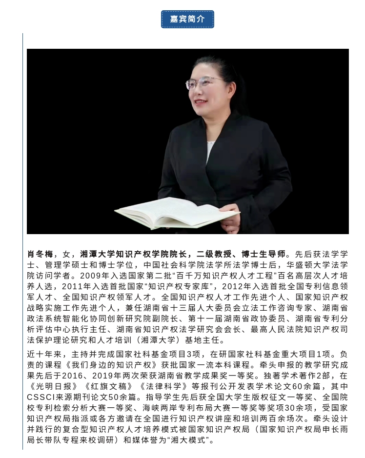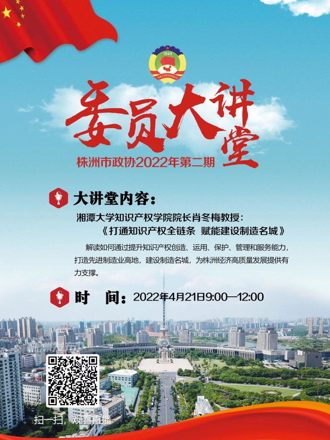 4月21日(本周四)9:00—12:00,株洲市政协2022年第二期“委员大讲堂”开讲,湘潭大学知识产权学院院长肖冬梅教授作辅导报告《打通知识产权全链条、赋能建设制造名城》,解读如何通过提升知识产权创造、运用、保护、管理和服务能力,打造先进制造业高地,建设制造名城,为株洲经济高质量发展提供有力支撑。