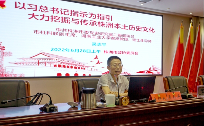 讲座中,吴志平以“大力挖掘与传承株洲本土历史文化”为主题,全面解读了文化自信,株洲拥有丰厚的历史文化。他还结合自己多年来的研究成果和实践经验,对住在市如何传承与保护我市本土历史文化提出了意见和建议,如加强历史文化名人资源保护与利用、加大文物及遗产保护力度、在城乡建设中加强保护、加强本土非遗文化保护等,为全体与会人员奉献了一场专业的历史文化知识大餐。