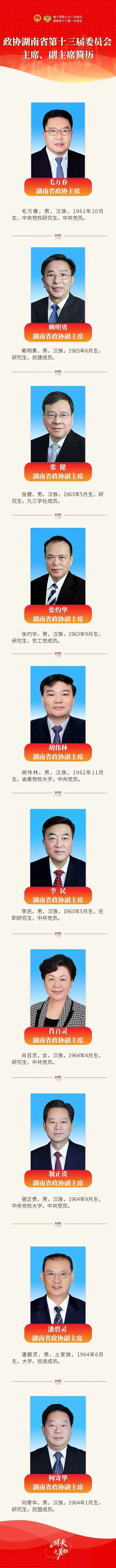1月17日上午,湖南省政协十三届一次会议举行第二次全体会议,选举毛万春为第十三届省政协主席;选举赖明勇、张健、张灼华、胡伟林、李民、肖百灵(女)、虢正贵、潘碧灵(土家族)、何寄华为第十三届省政协副主席;选举邓群策为第十三届省政协秘书长;大会还选举了123名同志为第十三届省政协常务委员。