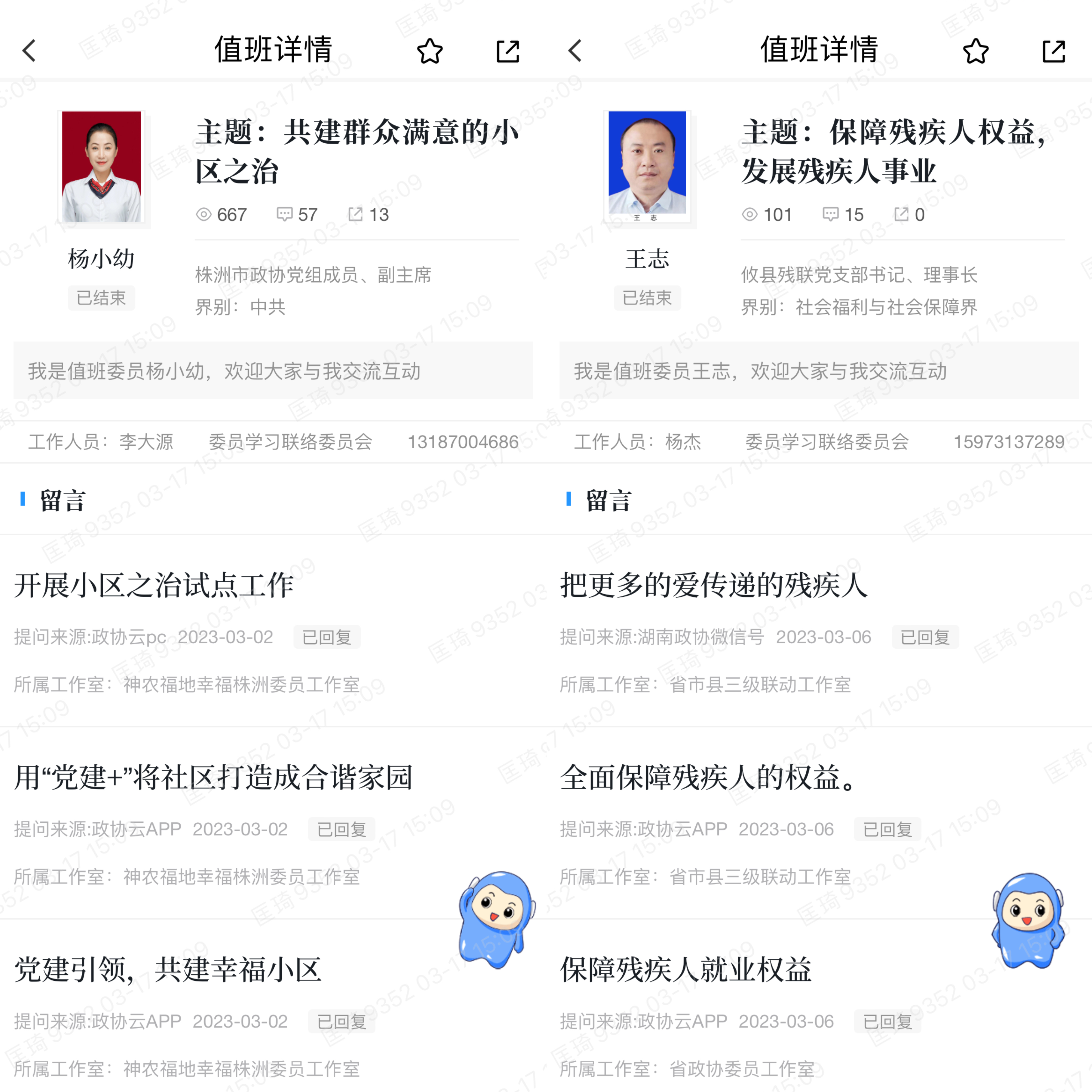 市政协委员、市政协副主席杨小幼值班主题为“共建群众满意的小区之治”。在当天的57条留言中,有的建议探索小区党建引领城市“微治理;有的建议形成共建共享的治理机制;还有的建议要因地施策的做好小区治理工作......。杨小幼回复说:“感谢您的建议,市政协2023年首期‘株事好商量’活动就将聚焦‘共建群众满意的小区之治’开展协商,我们将认真吸纳大家好的意见和建议,共同推动小区的建设。”
