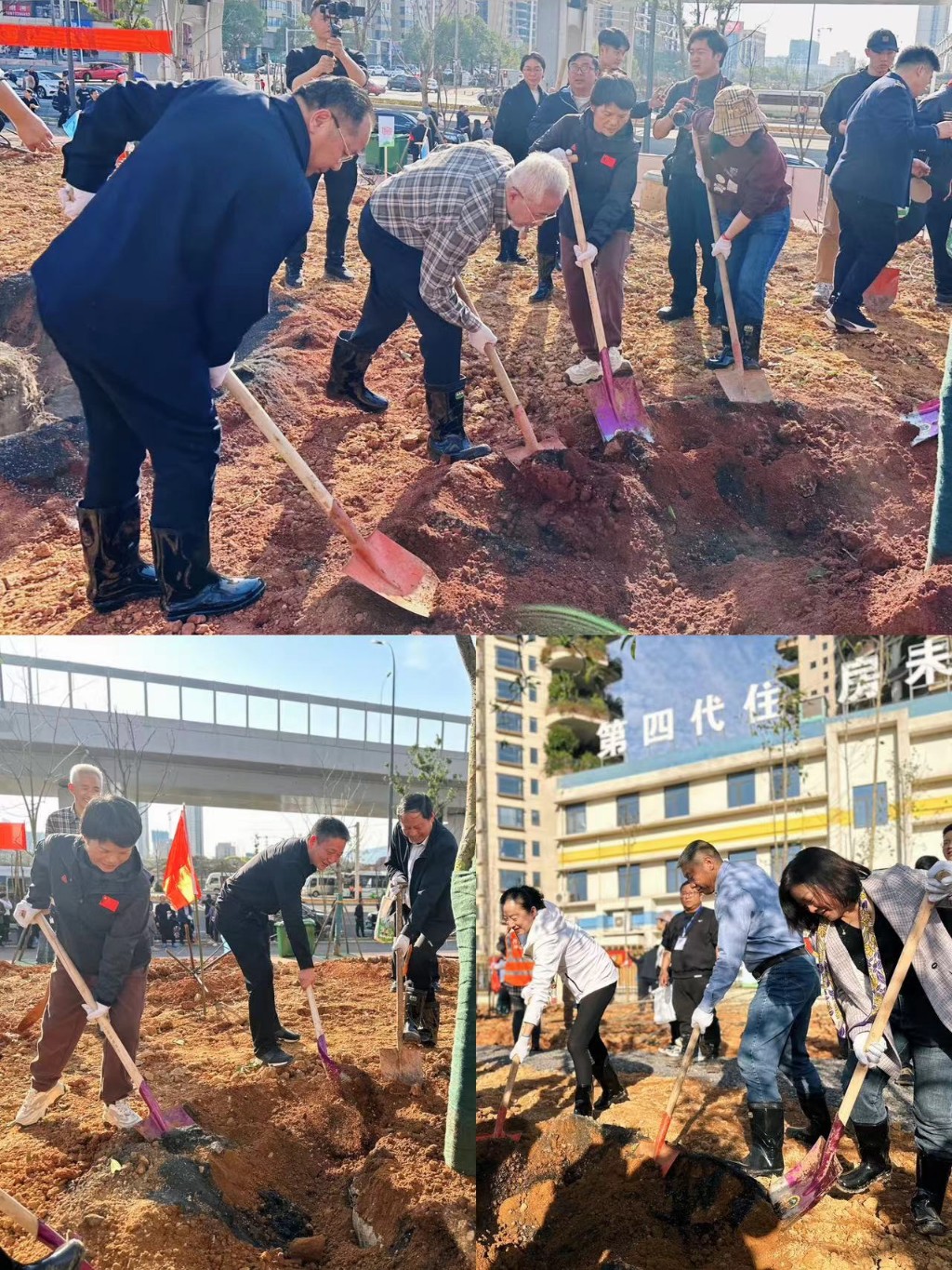 来到植树点,大家挥锹铲土、扶正树苗、培实新土,现场一派繁忙景象。在大家的共同努力下,一株株枫香、银杏、紫叶李、桂花树、棱角山矾等新植树苗被栽进沃土、迎风挺立,孕育着勃勃生机。