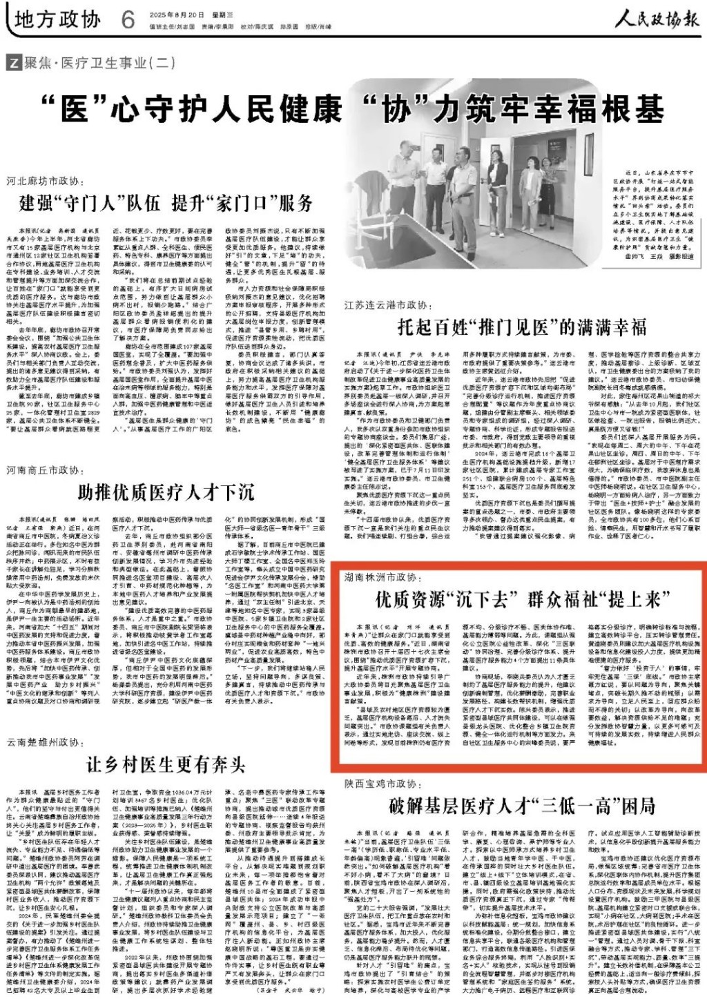 2025年8月20日出版的《人民政协报》第6版,刊发了《湖南株洲市政协:优质资源“沉下去” 群众福祉“提上来”》,现予以转发。