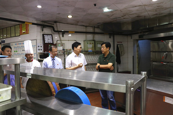 市政协副主席朱庸靖(右一)在逸景华天酒店厨房检查设施设备和环境卫生状况