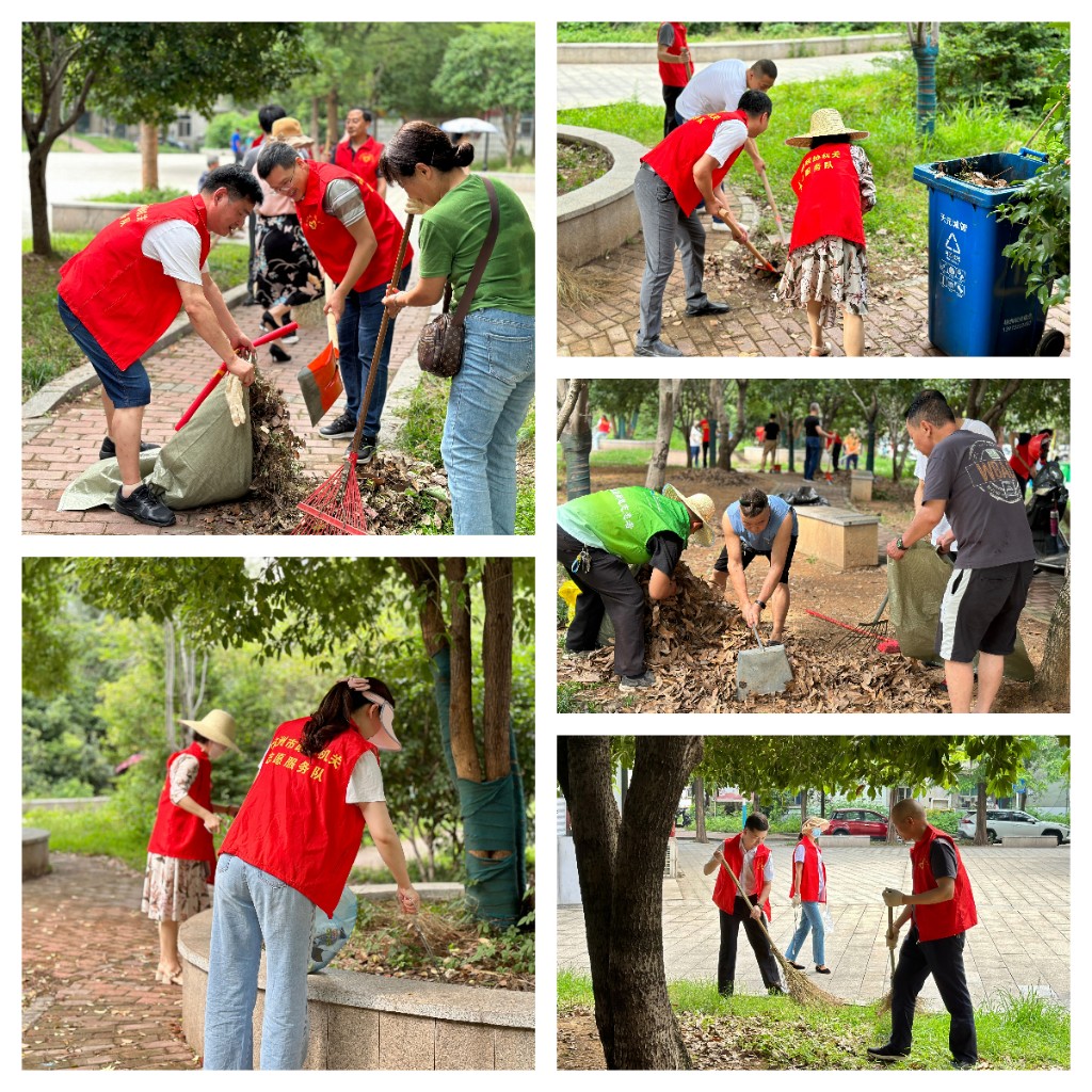 到达指定位置后,按照滨江社区的清扫需求,大家齐心协力忙碌起来。或是蹲在地上一根根拔除杂草,或是稳健的挥动扫帚将各种零散垃圾、树叶扫成一堆,或是将垃圾废弃物等铲入垃圾袋,搬运至垃圾箱。夏日炎炎,大家汗流浃背,不畏脏污,和社区同志们一道将居民小区变得更加干净、整洁。