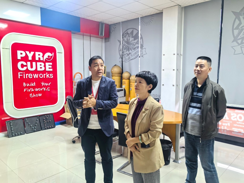 周雪辉一行还调研了醴陵市吉利鞭炮烟花有限公司,实地察看企业烟花爆竹加工区和展览区,详细了解企业发展、安全生产、产品销售等情况,并与企业负责人深入交流。