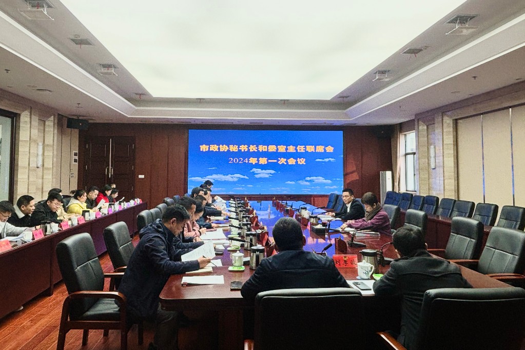 1月3日,市政协召开秘书长和委室主任联席会议2024年第一次会议,总结前阶段工作完成情况,研究讨论2024年度政协重点工作。市政协秘书长许志汉主持会议,市政协副秘书长、各委室主任出席。