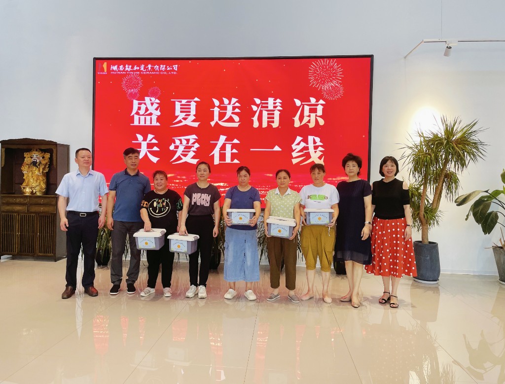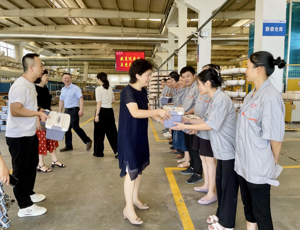 程轶辉一行先后到湖南红官窑瓷业、银和瓷业,为默默奋战在高温一线的劳动者送上清凉物资。详细询问了他们的工作、生活情况,对大家不畏酷暑坚守工作岗位的精神表示赞许,并叮嘱他们在高温天气下劳作的同时要保重身体和身心健康。
