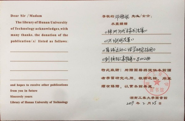 这是湖南工业大学发动全校师生为校图书馆捐赠图书的倡仪以来,首个响应倡议的民主党派人士,也是目前以个人名义捐书数量最多的教职工。邓珊妮用实际行动为学校的发展添砖加瓦,履行着一名人民教师无私奉献的光荣职责。