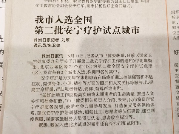 提案立案后,得到了株洲市卫健委高度重视。办理过程中,适逢国家卫健委开展第二批全国安宁疗护试点城市,市卫健委立即组织申报,成功获批,在试点的71个市(区)中,湖南省共有三个城市入选,株洲市名列其中。