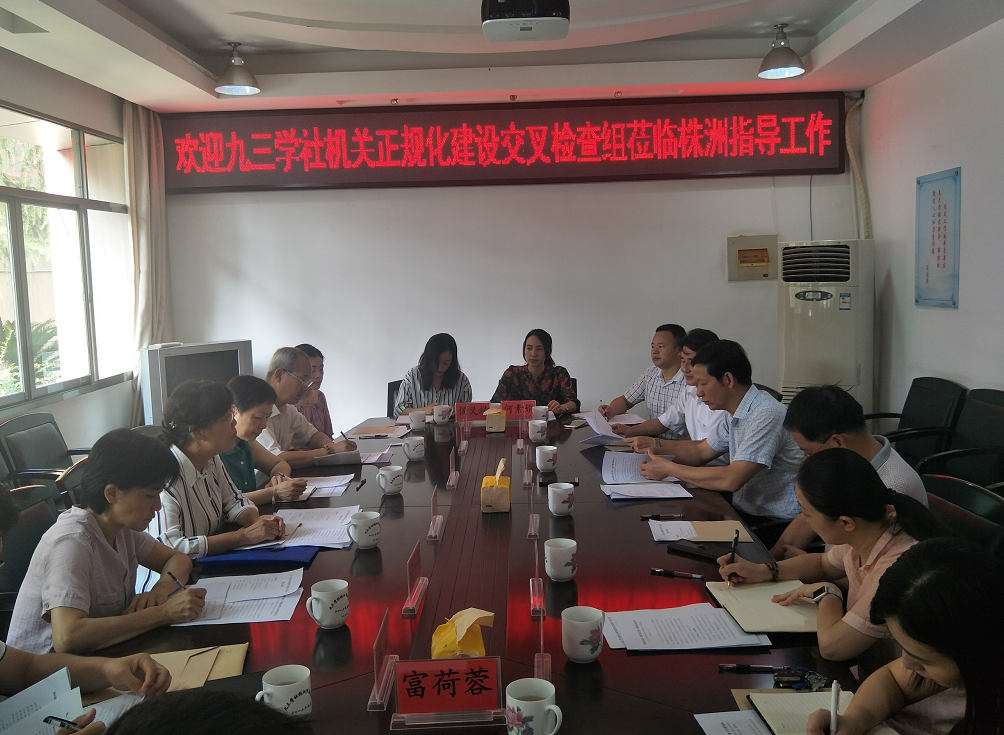 8月22日至23日,九三学社中央机关正规化建设交叉检查组莅临株洲,对九三学社株洲市委机关正规化建设工作进行检查指导。九三学社中央办公厅文秘处调研员闫士萍出席并指导工作。检查组由九三学社宁夏区委、社上海市委和两省部分市级组织机关干部为检查组成员。中共株洲市委常委、统战部部长覃万成,社湖南省委副主委、市政协副主席、社市委主委金继承,社市委副主委肖运平、周建明出席相关活动。