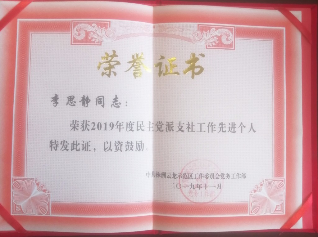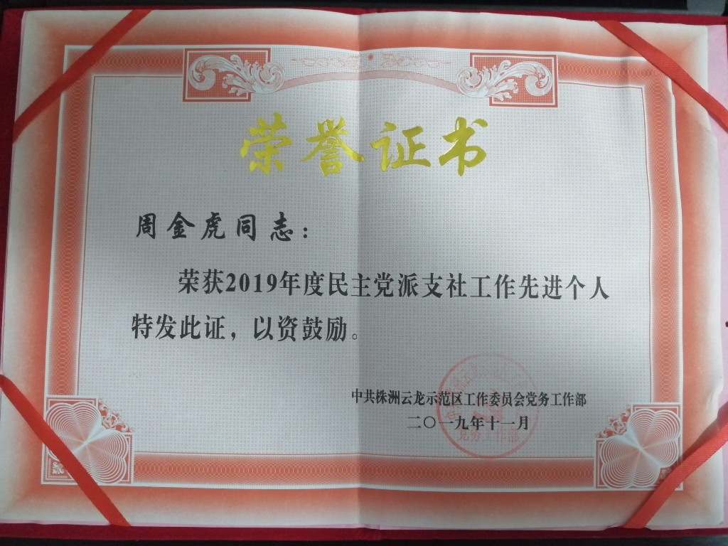 会上,九三学社株洲市云龙支社社员周金虎和李思静被评为株洲市云龙示范区2019年度民主党派支部(社)工作先进个人。