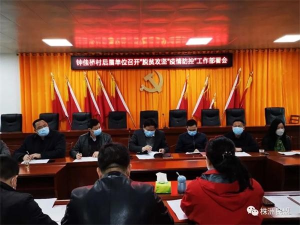 会上,钟佳桥村支、村两委负责人介绍了村里的基本情况,就2020年的工作设想做了汇报,驻村工作队队长汇报了工作队驻村以来的工作情况和下一步工作打算。株洲市国投集团、湖南化工职院两家后盾单位及株洲市公共资源交易中心、民盟株洲市委相关领导都做了发言,表示将尽全力支持钟佳桥村的脱贫攻坚、乡村振兴工作,并当场表态给予一定的帮扶款和物资。尹剑峰专职副主委说:“民盟市委虽然不是后盾单位,但我们不会当观众,我们將发挥党派的特有优势,对照村里今年计划完成的14项工作任务找到着力点,围绕其中村庄规划、特色产业发展、居家养老服务中心建设等项目,汇集盟内力量,积极开展调研和参加帮扶。”