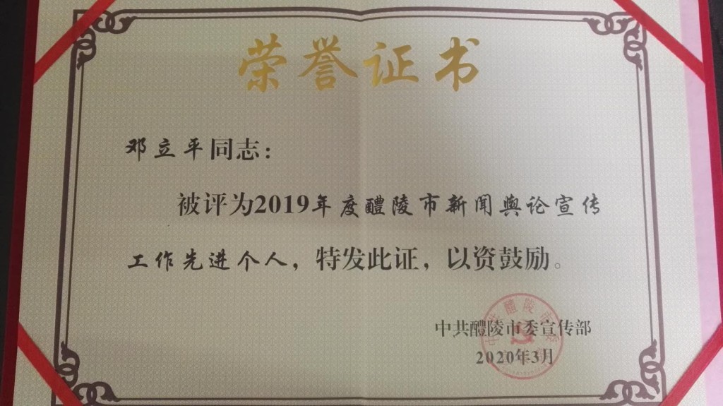 从2020年3月26日醴陵市宣传工作会议上传来喜讯,民革醴陵市委副主委邓立平获评醴陵市新闻舆论宣传工作先进个人。