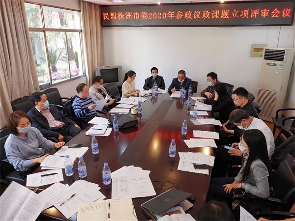 4月16日下午,民盟株洲市委会召开了2020年参政议政课题立项评审会议,市政协副主席、民盟株洲市委主委柳怀德,专职副主委刘娅娟,市政协常委、副秘书长、民盟株洲市委会机关二级调研员尹剑峰,市政协常委、湖南工业大学生命科学与化学学院院长、民盟市委副主委汤建新以及部分机关干部组成评审组,对19个课题从选题及其重要性、研究团队能力、研究思路严谨性、预期成果等方面进行评审。