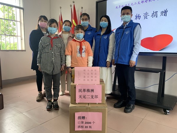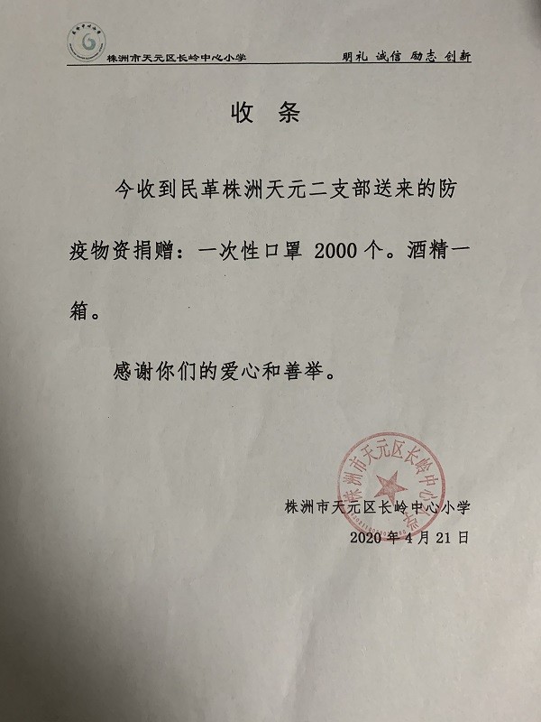 本次活动中,民革株洲天元二支部捐赠长岭中心小学:口罩2000个,酒精20瓶。