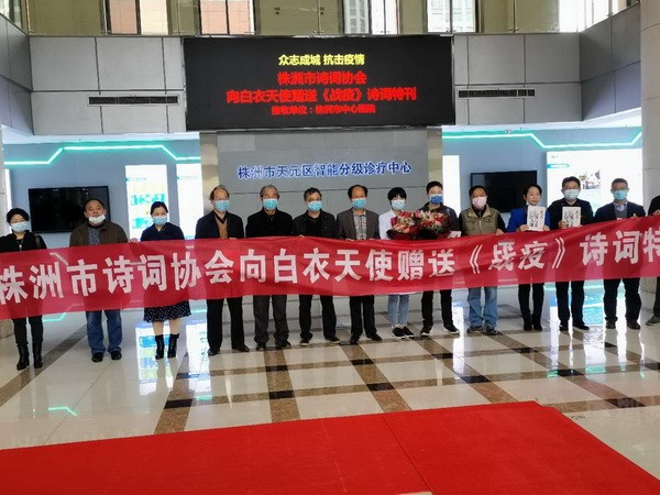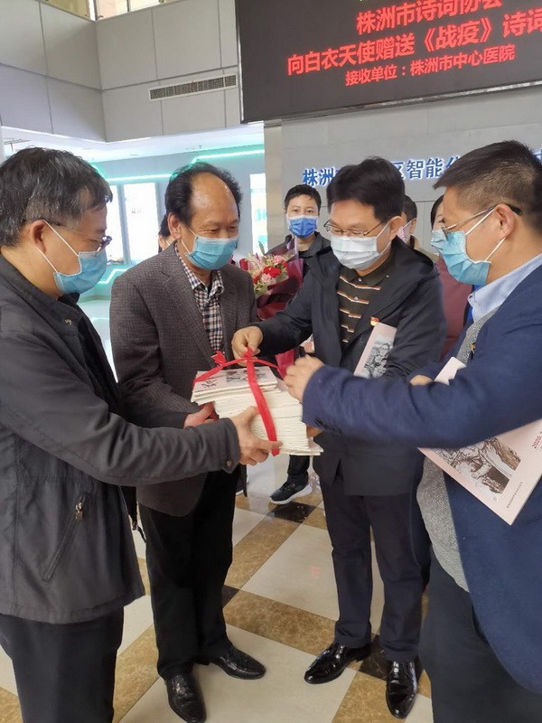 2020年4月23日,民革株洲市委会联合市诗词协会向市中心医院白衣天使们赠送《战疫》诗词特刊。黄石战役白衣天使代表,市中心医院副院长彭怀德、龙云铸,民革株洲市委专职副主委汪迎伟,市诗歌协会会长贺夏盛,副会长侯李平、谭天恩、马焱明、汤树林,天元区诗联协副会长胡立军,市诗词协会副秘书长高其蓉,《株洲诗词》副主编刘诗文,编辑阳敏等三十人出席捐赠仪式。赠送仪式由侯李平副会长主持,贺夏盛会长和汪迎伟专职副主委向白衣天使代表献花,并向市中心医院赠《战疫》诗词特刊50本。高其蓉副秘书长现场吟诵了五首“战疫”诗词。