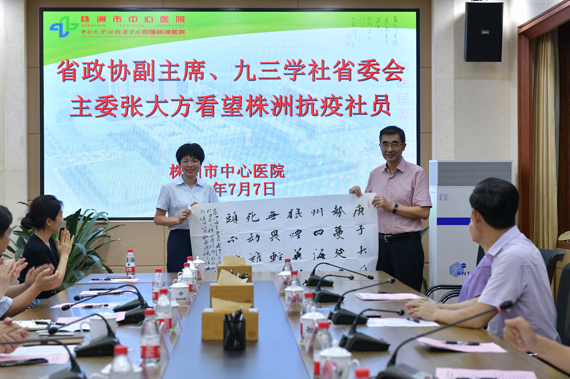 7月7日晚,省政协副主席、九三学社湖南省委会主委张大方专程来到株洲市中心医院,看望慰问抗疫一线的医务人员,并向援鄂医生梁彦超赠送书画作品。社省委专职副主委李少阳,社省委副主委、社市委主委、市政协副主席金继承陪同并参加座谈会。