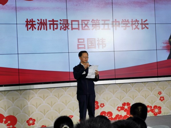 渌口区第五中学校长吕国祎代表全校师生致欢迎词,民革湖南省委副主委、株洲市委主委、株洲市人大常委会副主任刘春生,中共渌口区委常委、区委统战部部长唐杰先后在仪式上讲话,向在座同学们介绍了株洲民革关爱抗战老兵的工作,并对两位老兵的到来表示热烈地欢迎。