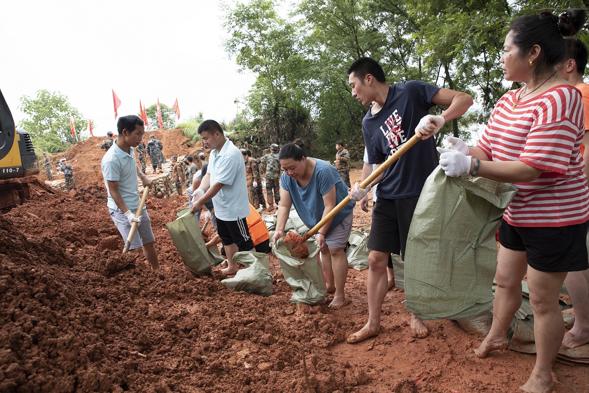 7月12日,接到上级通知,石亭大桥处有塌方地段,需要战友帮忙装土袋,王常平委员第一时间在群内发紧急通知,半个小时后带着18人、270箱水、16件法饼、15箱牛奶赶到现场,到现场后,争分夺秒的脱鞋、下物资,立即投入到紧张的工作中,搬土袋、装土、铲土,系口袋…….分工明确,配合默契,满是泥浆的衣服被汗水雨水浸透,脚底磨破了皮肉,也没人喊苦,没人喊累,配合民兵一起,成功完成了一段几百米的堤坝恢复。