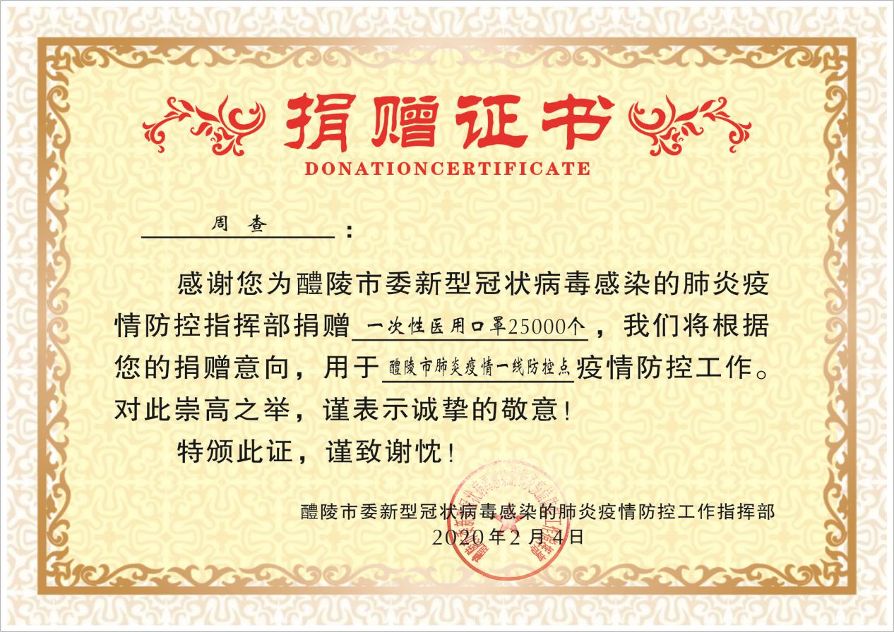 此外,周查还通过多次协调,帮助醴陵市委疫情防控工作指挥部联系购买了10万只防疫口罩。