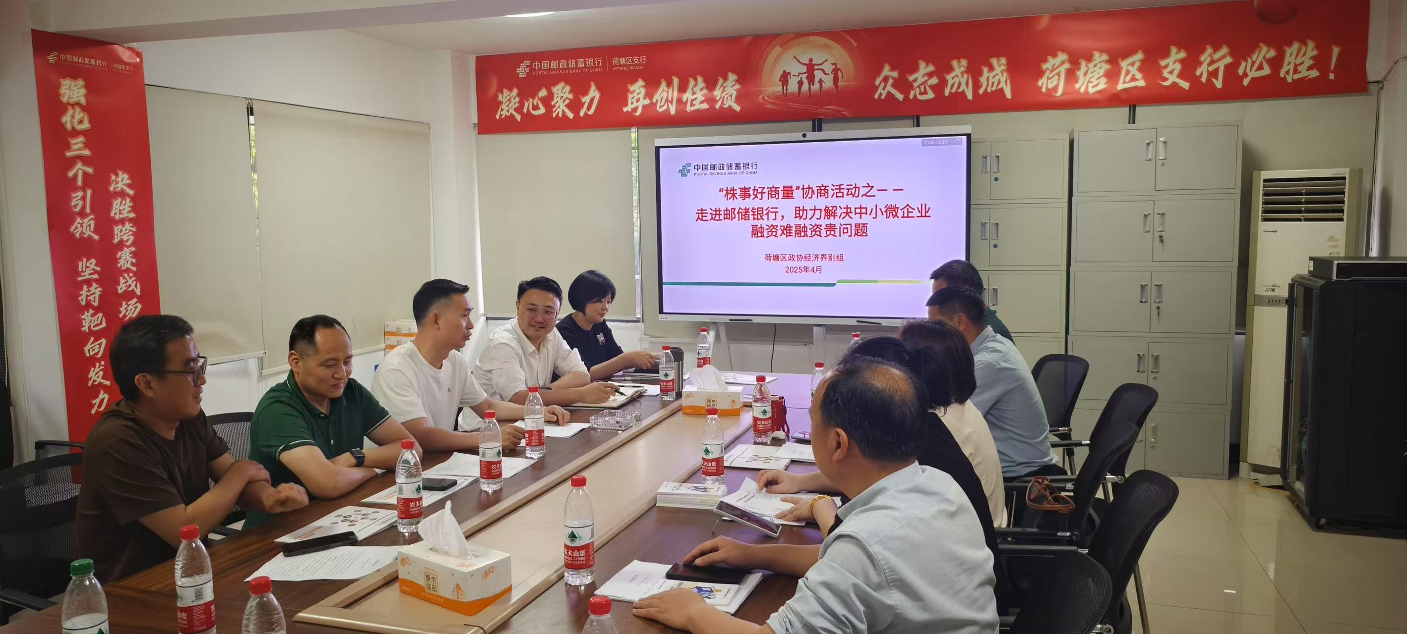 4月11日下午,荷塘区政协经济界别组走进邮储银行荷塘区支行,举行以“助力解决中小微企业融资难融资贵问题”为主题的“株事好商量”集中协商议事活动。通过实地调研、座谈交流等形式,搭建银企对接平台,凝聚发展合力。区政协副主席张茂、区政协经科外事委相关负责人、经济界别组委员等参加活动。